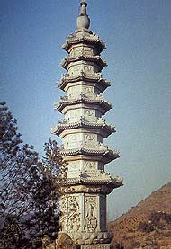 The stone pagoda on the hillside was built during the reign of Emperor Qianlong of the Qing Dynasty, The octagonal pagoda has seven storeys, all made of marble. It is a solid multi-eared structure with no doors or windows. On all eight sides of the body there are carved statues of Buddha, religious stories of Buddhism and various ornamental carvings. The story of Sakyamuni is depicted in pictures carved around the neck of the Sumeru pedestal. The exquisite workmanship represents the artistic style at the height of the Qing Dynasty.