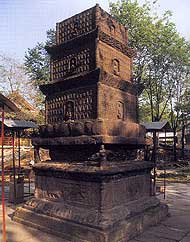 Carved all over the pagoda's body are images of Buddha. In the middle of every side is a big niche for the statue of seated Buddha. The surbase is surrounded by huge lotus petal designs and supported by a two-tier Sumeru pedestal. They are all made of iron. The eaves and pedestal are engraved with superb images of flying apsarases, celestial guards and other designs.