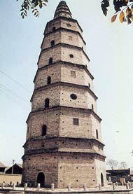 The octagonal, thirteen-storeyed brick structure is fifty-four meters high. Its main feature is a smaller pagoda on top. The seven-storey main body of the pagoda is sturdy and gigantic, with a winding staircase inside. The smaller six-storey pagoda on top tapers sharply, making it look like a steeple. It is not clear whether this was the original design or a renovated one.