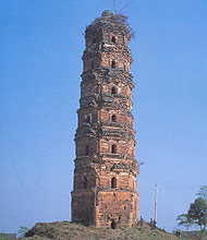 The pagoda stands on a hill at the western edge of the ruins of the ancient county town of Fuliang in present-day Jingdezhen. It was originally a pagoda at Xita Temple and is known as Red Pagoda because of the reddish color of the bricks it is built of. It is believed to be the most ancient large pagoda in Jiangxi and one of the most ancient Song Dynasty pagodas in Jiangxi and one of the most ancient Song Dynasty pagodas in the country. According to Fu Liang Xian Zhi (Records of Fuliang County) "Xita Temple, situated in the western corner of the town, was constructed by a monk in 832 during the Tang Dynasty. The pagoda, thirteen Zhang [about forty-three meters ] high, was built in 961 during the Song Dynasty on the initiative of Li Wenbiao, a local resident, and was rebuilt in 1575 during the Ming Dynasty. Analysis of the appearance and structure of the pagoda shows that the pagoda is a relic of the Song Dynasty and the renovation during the Ming Dynasty was minor.