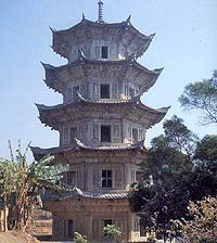 Among the many stone pagodas in Fujian the Sakya Buddhist Pagoda has its own unique style. First, the pagoda looks sturdy and firm and its pent roofs are wide and exquisite. The stone staircase inside is wide and the interior of the pagoda looks even and spacious. The balconies on each floor are also spacious. People can go up and down the pagoda as conveniently as if they were in an ordinary building. These characteristics distinguish this pagoda from all other multistoreyed stone pagodas in the country.