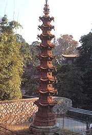 The ornaments on the pagodas are splendid. Sculptured on the wails are 1,078 images of Buddha. On the pedestals are vivid sculptures of celestial guards carrying a hundredweight, racing lions and flowers. Hung under the corners of the pent roofs are bells that ring when a breeze blows. The three-tiered steeples are calabash-shaped and crowned with a valuable bead. Carved on the bases are the year of the pagodas' construction and their names, as well as the names of benefactors and craftsmen who manufactured the pagodas. The pagodas are important not only for examination of the development of China?s ceramic technology.