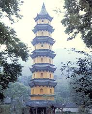 This brick pagoda was first built in the Tang Dynasty and reconstructed in the Yuan Dynasty. The hexagonal, seven-storey structure, about thirty-seven meters high, is one of the best known ancient buildings inside Asoka Temple.