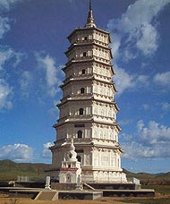 This pagoda is located at the northwest corner of the ruins of the ancient city of Qingzhou from the Liao Dynasty in Bairin Right Banner near Chifeng City. The pagoda is estimated to have been constructed between 1032 and 1055. The octagonal pagoda, about fifty meters high, has seven storeys. Each side of its octagonal base is 10.34 meters long. Originally a staircase in the first storey led to upper levels, but it was dismantled later and the first storey was turned into a prayer hall.