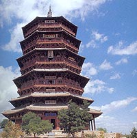 The real name of the pagoda, located in Fogong (Buddha's Palace) Temple in the northwestern corner of the county town of Yingxian, is Sakyamuni Pagoda. Since it was built completely of timber, it has been known popularly as the Wooden Pagoda of Yingxian County. Standing 67.31 meters high, it is the only extant large wooden pagoda in China and also the tallest among ancient wooden buildings of the world.