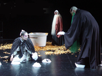 Percussion is heavily used in the play, but the results are different from the straightforward sound of percussion in traditional Peking Opera.