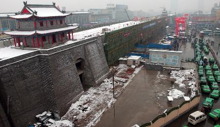 On Dec. 30th, 2003, renovations on the railway station section of the ancient rampart officially started, with a price tag of the project at 150 million Yuan. With its full length at 537.7 meters, the project was two-phased: one was an over 233-meter long connection wall that would include a three-arch wide-spanning bridge. The widest span of the bridge would be 84 meters. The other phase was to repair 304.3 meters of brick wall that also would include a few towers.