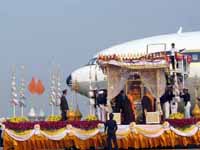 The holy tooth relic, enshrined in a sacred miniature pagoda and protected by bulletproof glass, was carried by a highly-decorated flatbed truck to Thailand's Royal Airforce Airport at Bangkok early Saturday.