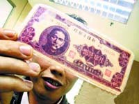 Equal in size to the current one yuan paper note, the historical piece of currency has maroon flower patterns on a white background, and a head portrait of Dr. Sun Yat-sen, the great revolutionary forerunner printed in the center.
