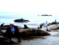 A fishery administration worker in Rudong of East China's Jiangsu Province tries to rescue some 33 dolphins, after hearing reports from local fishermen around 4 AM that a large brood of dolphins went aground at the county's seashore Friday morning. After three hours of rescue work, all the stranded dolphins were helped into the sea with the rising tide. Experienced fishing people said the rare grounding in the country of such a large number of dolphins may be caused by a strong ocean current after the dolphins lost their way in search of fish.