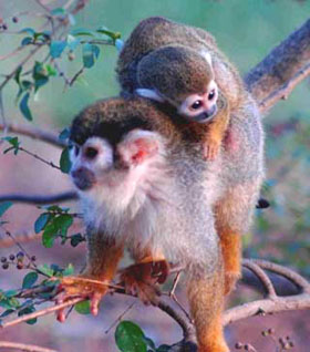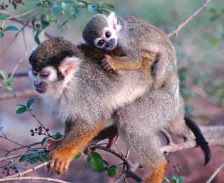 A squirrel monkey clings on the back of his mother in a wildlife park in Hefei, Anhui Province November 7, 2004. In July this year, four squirrel monkeys were born and the three others are now living independently in the park, but this one continues to depend on his mother. Squirrel monkeys, mainly living in South America, are under international protection.