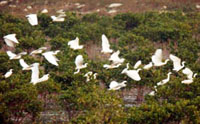 The picture shows that a group of egrets fly over the man-made mangrove forest in Chenghai of Shantou City, south China's Guangdong Province, February 23, 2003. The city has planted 17,875 mu (1,192 hectares) of mangrove since May of 1998 to improve environment in its coastal areas.