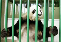 Shuan Shuan, one of three female Pandas at Mexico City's Chapultepec Zoo, stands on her hind legs in a cage in the zoo on April 11, 2003. Shuan Shuan and Xin Xin, another female panda, have been artificially inseminated with the sperm of a male panda Ling Ling on loan from China. Ling Ling has visited the Mexico City zoo three times in the hope of mating with the females but to no avail. Zoo authorities have resorted to artificial means to bring about a pregnancy.