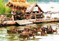 A flock of wild ducks are playing in Shichahai Lake, Beijing. The nearby raft was especially made for them by a local resident.