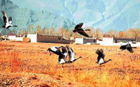 A flock of black-necked cranes having returned from India fly over a remote county in Tibet Autonomous Region, home to this crane species.