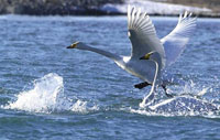 Two swans lark on the Wulapo reservoir in the suburbs of Urumchi, capital of northwest China's Xinjiang Uygur Autonomous Region Dec. 11, 2003. The environment improvement of the oasis city have fascinated some ten swans to spend their winter days.