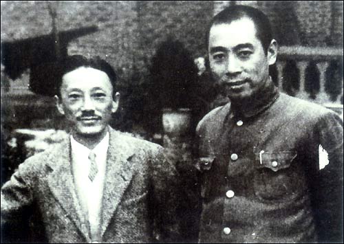 The Party made extensive contacts with patriotic democratic forces and supported their anti-Japanese democratic proposals and activities. Zhou Enlai is shown here with patriotic general Jiang Guangnai in Chongqing.
