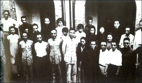 In February 1938, Zhou Enlai became concurrently the deputy director of the Political Department of the Military Council of the National Government. While in the post, Zhou made extensive contacts with people from various circles in order to promote the anti-Japanese united front. Zhou Enlai (fourth from left, front row) with Guo Moruo (fifth from left), director of the Third Division of the Military Council in charge of propaganda work, and part of the staff.