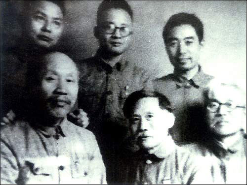In order to strengthen the Party's leadership over the mass work in the Kuomintang-controlled areas and the united front work, the CPC Central Committee set up the Changjiang Bureau and the Southern Bureau in Wuhan and Chongqing. Shown here are Zhou Enlai, Qin Bangxian, Ye Jianying and Dong Biwu, leaders of the Southern Bureau, with Lin Boqu and Xu Teli in Chongqing.