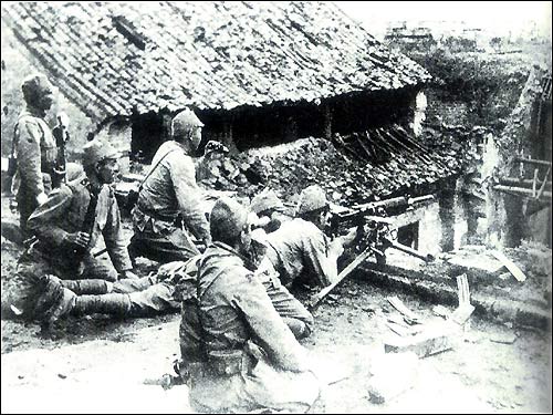 In April 1944, the Japanese started their "Operation Number One." Shown are the Japanese troops strafing non-combatants in Xinyang, Henan Province.