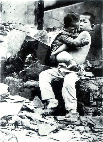 In May 1943, the Japanese troops "mopped up" Langya Mountain in Yixian County, Hebei Province. The parents of the brothers shown in the photo were killed by the enemy and their house torched.