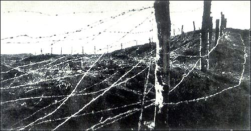 Unyielding barbed-wire fences around one of the many "no-man's-lands" created by the Japanese.