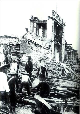 Japanese planes wantonly bombed Henan Province. Shown is Qiankou town, which became scorched earth after the bombing.