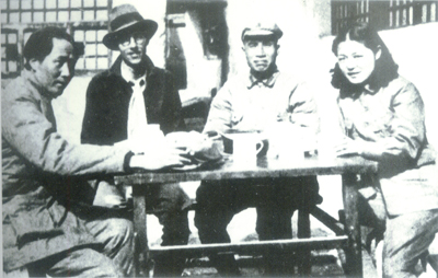 Mao Zedong and Zhu De meet with an American reporter (second from left) in Yanan. The situation in Europe was on the edge. The China theatre of war directly influenced the future of the world’s anti-Fascist war, so all nations turned their attention to Yanan.