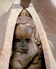 Perhaps the most important discovery in the latest excavation is the few clay coffins. Unearthed from the bottom layer of the tomb were four clay-covered wooden coffins, each surrounded by a circle of six or eight high wood stakes. The coffin covers, in rectangular shape, were wrapped with thick clay. Under the covers were wood chambers, in which straw baskets and wood articles were buried along with each of the deceased. Discovered beneath the wood chambers were boat-shaped coffins for the female dead. In death, they were accompanied by such articles as wool capes, gold earrings, wool necklaces and wood-sculpted male genitalia.