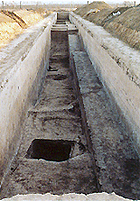 Another important discovery was a ring moat of the early Shang Dynasty (16th-11th centuries BC). It lay between the old city wall and the Xia Dynasty moats with which it ran parallel. Unlike the moats of the Erlitou culture, the Shang ring moat was shaped like a trumpet in cross-section, 13-15 meters wide at the mouth and just 1.5 meters wide at the bottom. Its depth varied from 4.0 to 6.8 meters.