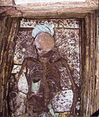 In the main chamber they found murals depicting the sun and the moon on each wall and the coffin, which was the most precious of all the relics. It rested undisturbed on a platform of eight colored supporting tiers where it had been placed all these long years ago. The red and black outer coffin, 2.3 meters long, 1.3 meters wide and 0.9 meters high, was decorated with images of cranes, phoenixes, peonies and clouds. The gilded cranes and peonies shone bright and wonderful for they had not lost their colors even though a millennium might have come and gone in the world outside. Wrapped in silk, the inner cypress wood coffin was some 1.6 meters long with colored golden dragons and flying phoenixes worked in bas-relief on the lid.