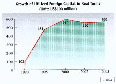 China utilizes foreign capital through various channels and forms, which fall into three major categories: 1) foreign loans, including loans from foreign governments, international financial organizations and foreign commercial banks, export credits, and issuance of bonds overseas; 2) direct foreign investment, including Chinese-foreign equity joint ventures, Chinese-foreign cooperative joint ventures, wholly foreign-owned enterprises and Chinese-foreign cooperative development projects; 3) other foreign investments, including international leasing, compensation trade, processing and assembly and issuing stocks overseas. From 1990 to 2001, foreign capital utilized by China in real terms totaled US$510.8 billion, including US$378 billion of direct investments by foreign businesspeople. In 2002, foreign capital utilized by China in real terms came to US$55 billion, ranking the country first in absorbing foreign capital in the world for the first time. In 2003, although China was hit by the outbreak of SARS in the first half of the year, foreign investment still maintained its momentum of rapid increase, and foreign capital utilized in real terms for the year totaled US$56.1 billion.