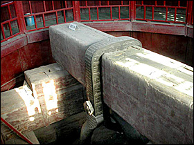The rectangular bronze bar threading through the handle of the bell is only 14.3 centimeters in height and 6.6 centimeters in width. It looks small and exquisite for the big bell 46 tons in weight. Visitors wonder whether such a bronze bar can bear the weight of the big bell for a long time. In 1989, our staff members and Professor Feng Changgen of Beijing University of Science and Engineering investigated the "dangerous" parts of the bell and calculated their strength. The bronze bar bears the blade load on two sections of the same size. So the blade load is 2.44 kilograms/square mm.