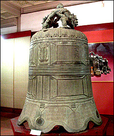 The bell of the Cypress Grove Temple was cast in the 46th year of the reign of Emperor Kangxi during the Qing Dynasty (1707). Part of the Buddhavatamsaka-mahavaipulya Sutra was carved on the bell, so it was also known as the Buddhavatamsaka-mahavaipulya Bell. The bell is 2.36 meters in height, 1.68 meters in rim diameter and 2,268 kilogrammes in weight. It was originally kept at the Cypress Grove Temple east of the Guozijian (Imperial College). The temple was built in the 7th year of the reign of Zhizheng during the Yuan Dynasty (1347) and rebuilt during the reign of Emperor Kangxi of the Qing Dynasty. Usually after a bell was cast out of its mould, its pouring head was removed. Then finishing touches were done. The surface of such a cast bell is more or less uneven. But the surface of the Buddhavatamsaka- mahavaipulya Bell is very smooth. The characters of the sutra cast on the bell are neat and graceful. They are so smooth that one can hardly believe that the characters of the sutra and the bell itself were cast simultaneously. According to an analysis, the entire bell was polished for a long time after it was cast. Another feature of the bell is that the pulao bell handle is superb and lifelike, vividly depicting the bravery and fierceness of the dragon's offspring. The legend goes that the dragon gave birth to nine sons, but none of them became dragons, and that one of them was called pulao whose roar shook heaven and earth. According to the Selections from Ban Gu, "There is the big fish called the whale in the sea and the animal called pulao at the seaside. The pulao is always afraid of the whale. Whenever the whale attacks the pulao, the latter roars. Whoever wishes to make a bell sonorous puts a pulao design on it. The striker is the whale." So the image of the pulao was cast on the bell. This made it possible to suspend the bell and express people's real wishes. This was an ingenious combination of art and reality.