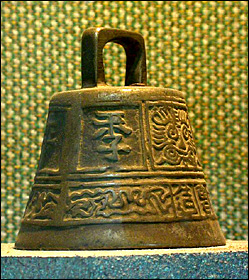 On the occasion of a family reunion for a New Year, people exchange best wishes and look forward to good luck in the coming year. They send greetings like "Fulfill your wishes" or "Happy New Year." In the past, many porcelain vases were decorated with Chinese rose designs and the characters si ji ping an. The character ping here was pronounced like the word "vase" in Chinese. The auspicious wording si ji ping an is rarely seen on bronzes. This set of small bells has been selected from our collection of ancient bells for the visitors, expressing our hope that the nation will be prosperous and the people will be strong and that they will be safe and sound in the four seasons.