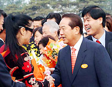 | Soong shakes hands with the crowd before board on a plane to leave Beijing for Taiwan via Hong Kong. |