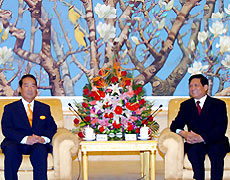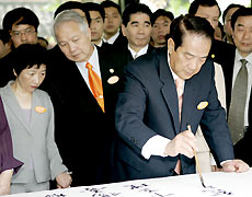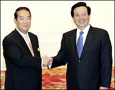 | Soong talks with Liu Qi, secretary of the Beijing Municipal Committee of the Communist Party of China. |