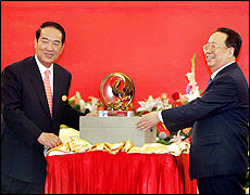 | Soong presents a gift to Yang Zhengwu, secretary of the Communist Party of China Hunan Provincial Committee. |