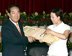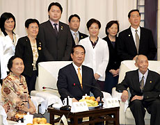 | Soong (L.) meets Wang Daohan, president of the mainland-based Association for Relations Across the Taiwan Straits in Shanghai on May 8. |