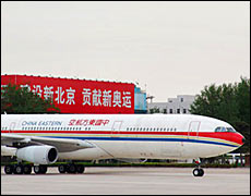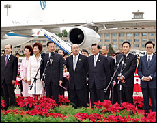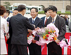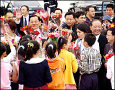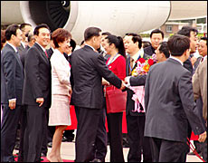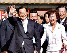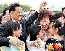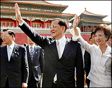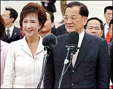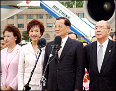 | Lien and his wife arrive in Beijing on April 28, 2005. |