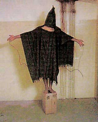A hooded and wired Iraqi prisoner at Abu Ghraib prison who reportedly was told that he would be electrocuted if he fell off a box, is pictured in this undated photo. (China Daily/Reuters)