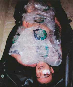 The body of an Iraqi prisoner, wrapped in cellophane and packed in ice. (China Daily/