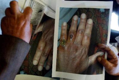 Iraqi Khayrullah al-Kinzawi, 65, shows the media pictures of the sores and tears on his hands that he suffered while jailed last year, soon after the American invasion of Iraq, during a press conference by human rights groups in Baghdad, Iraq, May 9, 2004. At the press conference numerous former prisoners came forward to tell of abuse -beatings by soldiers, sleep deprivation -- in accounts that resembled those found by US investigators at the notorious prison. (China Daily/AP Photo)