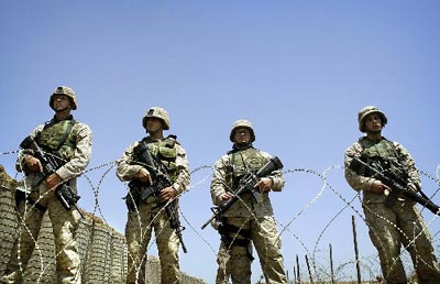 American soldiers guard outside the Abu Ghraib prison in Baghdad, Iraq, May 5, 2004. (Xinhua/AFP Photo)