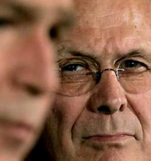 US Secretary of Defense Donald Rumsfeld listens gleefully as President Bush (left) speaks at a Pentagon news briefing May 10, 2004, strongly backing Rumsfeld against American people's calls for his resignation. The White House said after Bush met for more than an hour with Rumsfeld and military leaders at the Pentagon that the Defense Department was considering making public more videos and photos of the Iraqi prisoners abuse. (China Daily/Reuters)