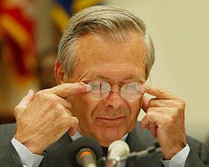 US Secretary of Defense Donald Rumsfeld rubs his eyes near the conclusion of his testimony before the House Arms Services Committee, May 7, 2004 in Washington. Rumsfeld offered "my deepest apology" to Iraqi prisoners abused by sadistic military personnel and warned that videos and photos yet to come could further inflame worldwide outrage. (China Daily/AP)