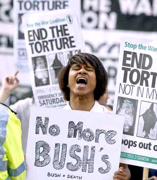 A demonstrator takes part in a protest as former US President George Bush Senior attends a dinner party hosted by Republicans Abroad at a hotel in central London, May 18, 2004. Bush is on a visit to the UK to raise funds for the re-election campaign of his son, the current US President George W. Bush. (China Daily/Reuters)