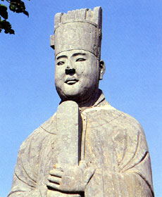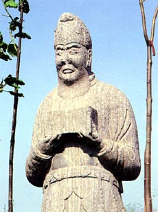 The Yongxi Mausoleum is an example. The sculpted human figures are vivid in expression and social status is truthfully depicted. For example, the eunuchs are full checked, broad of forehead, reverent and respectful, holding the horsetail whisks, very carefully awaiting the emperor's call; the chuanlu, with square faces and large ears, are immaculately dressed with one hand hanging down, the other on their chests, concentrating their attention awaiting imperial orders; the zhendian generals, holding swords, helmeted and armored, round faced and large-eyed, gaze ahead militantly. Sculptors mostly favored, smooth, round carvings, supplemented by level, straight segments.
