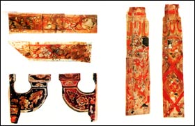 Colors used in paintings on pillars, beam ends and brackets in the various chambers of Li Bian's mausoleum are very colorful pigments of azurite, malachite, ochre, cinnabar and others. The designs are mostly peonies, stock roses, lotuses, a type of pomegranate flower and wavy cloud patterns. Of a relatively early date, these have provided important concrete data in research on architectural paintings.