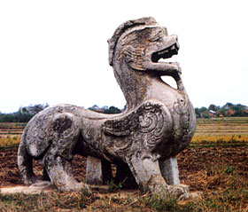 The unicorns and ferocious beasts in front of the tomb of Liu Yu, Emperor Wu Di of the Song Dynasty, are a good example to use for an explanation. With huge stones carved in a rough-cast way, the finished animals exhibit a simple and unsophisticated style, connecting closely with the carving styles of the Han Dynasty.
